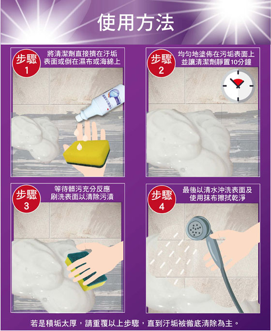 ★不含磷的乳狀特殊配方,含有超微細研磨顆粒,可對付特別難除的水垢、皂垢、銹斑、重垢,輕鬆去除,乾淨有效率
